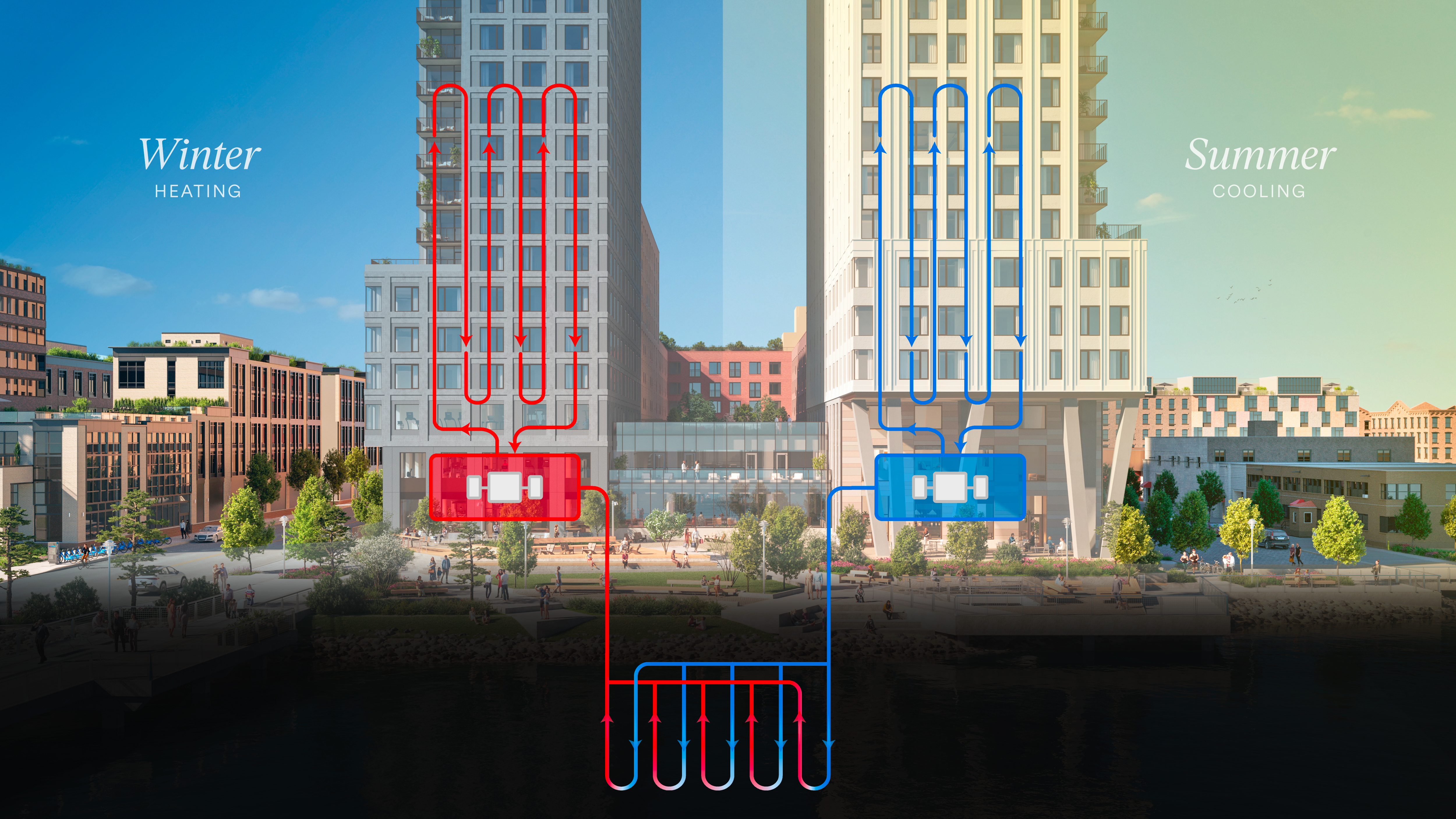 An all-electric, closed-loop energy system uses high-efficiency pumps to heat and cool every residence by leveraging the steady temperature of the earth. In winter, the pumps pull warmth from deep below ground. In summer, they release heat beneath the surface. The result: year-round climate control using far less energy.